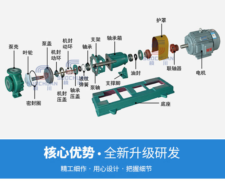 IHF(D)型離心泵是IHF型離心泵的派生產品,是為滿足IHF離心泵性能要求同時受工作場地限制而研制的產品。所有過流部件均采用氟塑料或氟塑料合金制造,耐腐蝕范圍廣;基體采用金屬制造,承壓能力強;軸封采用先進的WB2型外裝式波紋管機械密封,密封性能可靠;采用短支架直連結構,葉輪軸與電機軸采用可靠的莫氏錐度傳遞扭矩,泵機占地面積小。